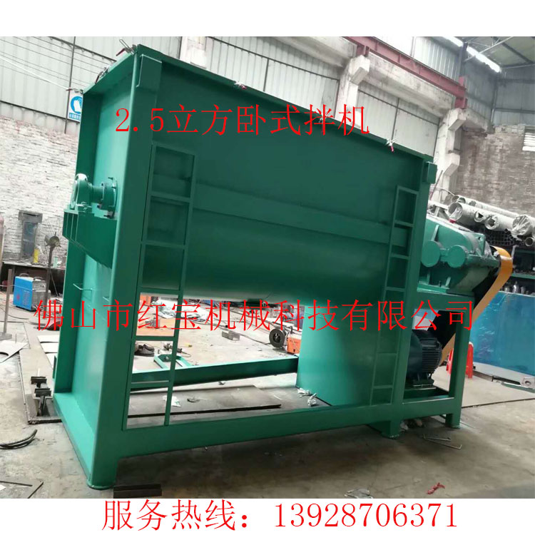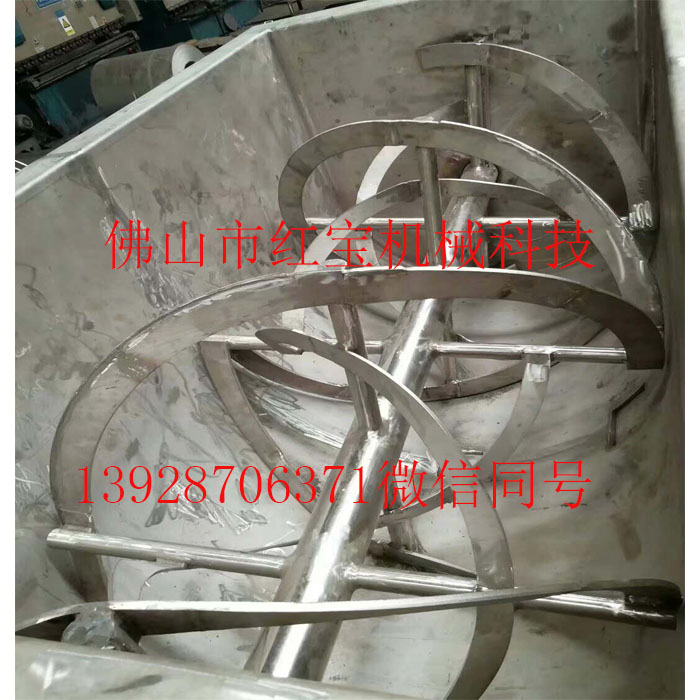 干粉臥式攪拌機實際上是一種混合率高、殘留物少的設(shè)備。也可廣泛應(yīng)用于塑料顆粒、塑料粉、化工粉、油漆、硅藻土、藥粉、中藥粉等粉末。本實用新型的特點是:雙螺旋帶結(jié)構(gòu),兩側(cè)物料通過大螺旋帶由兩側(cè)向中間推送,中間物料通過小螺旋帶向兩側(cè)推送,除適合攪拌粉末外,還可以加入液體藥劑,根據(jù)需要添加噴淋裝置,并通過空氣壓力原理將液體驅(qū)動到水平混合器的頂部,然后用噴頭噴灑液體。