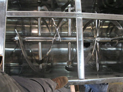 1.機(jī)槽為U形體,采用不銹鋼制造,內(nèi)裝攪拌槳葉,橫臥在塑料臥式攪拌機(jī)的減速器與倒料減速器上.